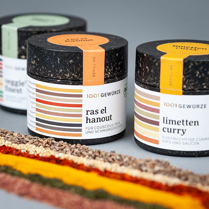 Gewürze haben wunderschöne Farben. Und zwei natürliche Feinde: Licht und Feuchtigkeit. Vor denen wollen wir sie in jedem Fall schützen. Aber an den Farben sollt ihr euch natürlich trotzdem erfreuen! Deshalb haben wir Stunden vor dem Pantone-Farbfächer verbracht und jedem unserer Gewürze seine eigene Farbe zugeordnet. Die Mischungen haben somit ihren ganz eigenen Streifencode erhalten: die Farben von oben nach unten entsprechen exakt der Zutatenliste. So seht Ihr auf einen Blick, was drin ist. Und habt gleichzeitig optimalen Licht- und Aromaschutz.